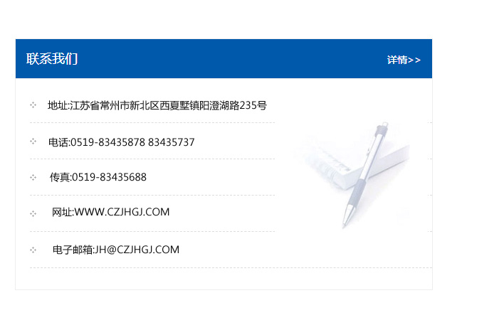 傳真:0519-83435688    郵編:213135    網址:WWW.czjhgj_com.bjmanna.com    電子郵箱:JH@czjhgj_com.bjmanna.com